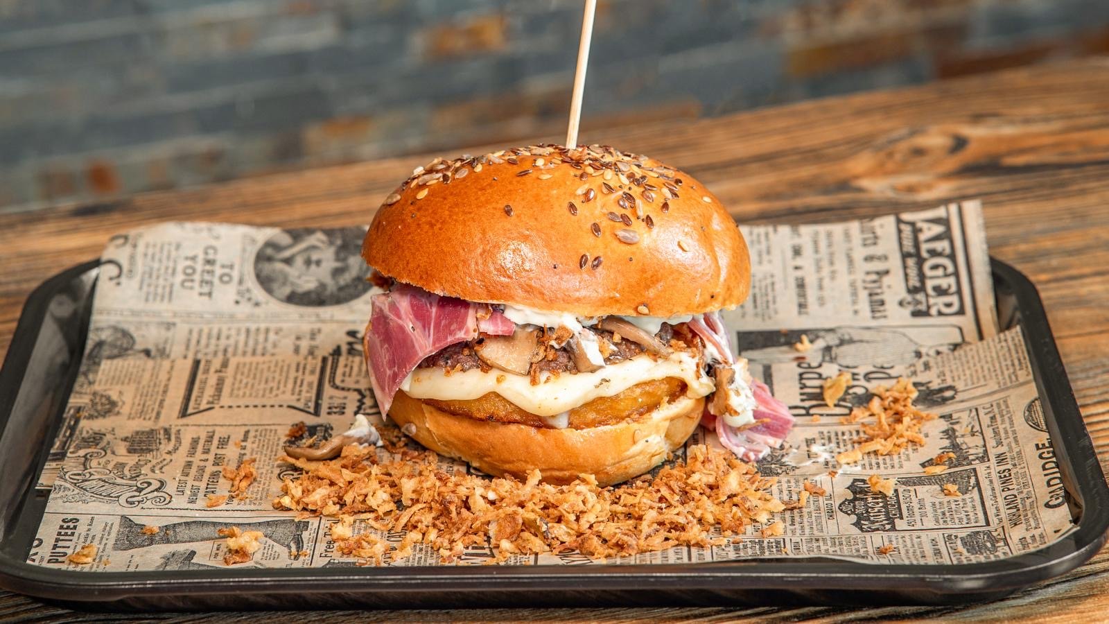 Steak haché,bacon,rosti,raclette,oignons frits, champignon,tartare